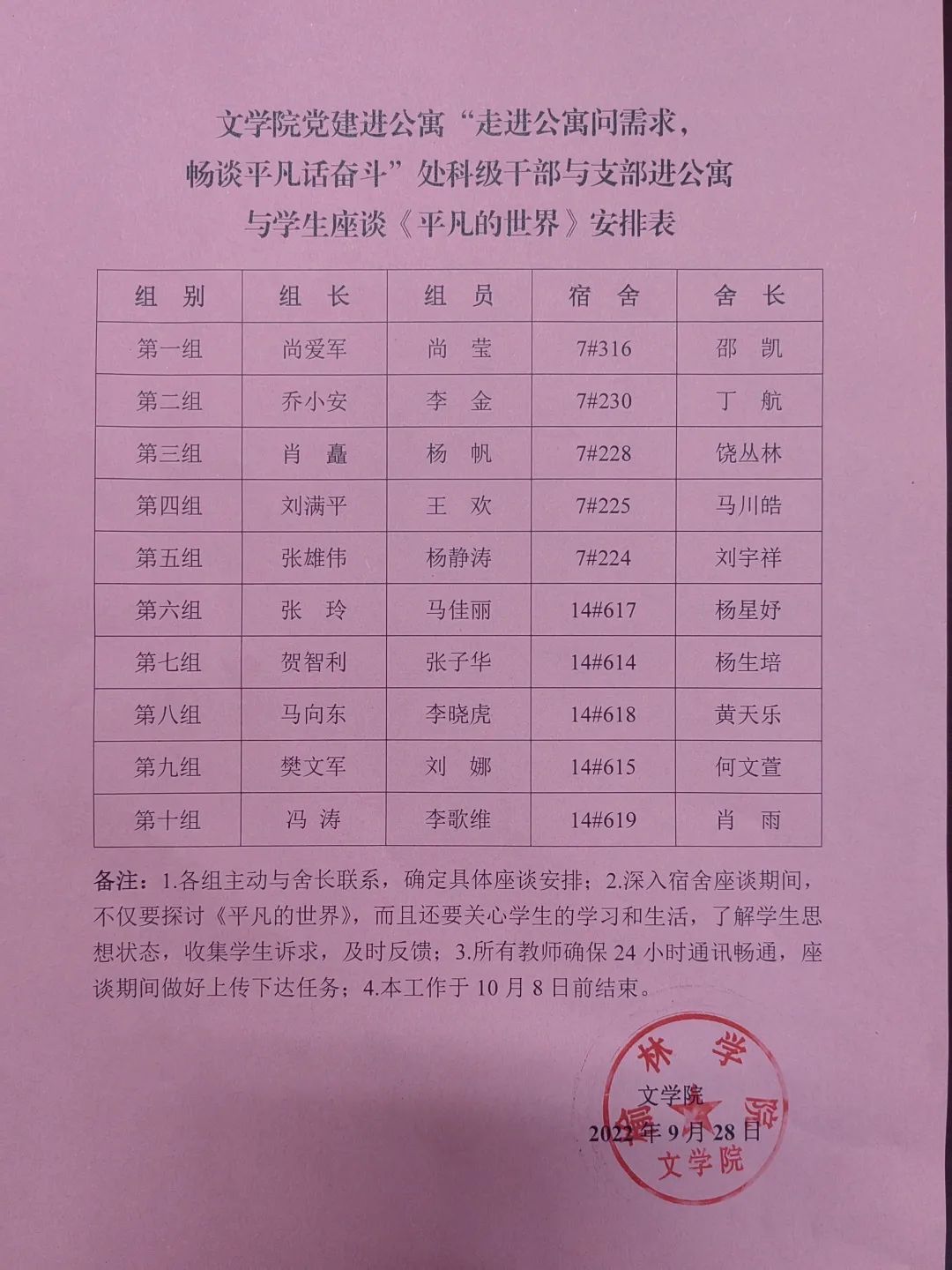 为积极响应校党委“走进公寓问需求,畅谈平凡话奋斗”活动号召,进一步增强文学院2022级新生思想政治教育的实效性和亲和力,营造浓郁的书香校园文化氛围,培养学生奋斗精神,国庆期间,文学院与审计处、图书馆科级以上干部、辅导员、班主任继续深入新生宿舍与学生面对面交流,畅谈《平凡的世界》读书心得体会,分享奋斗历程。