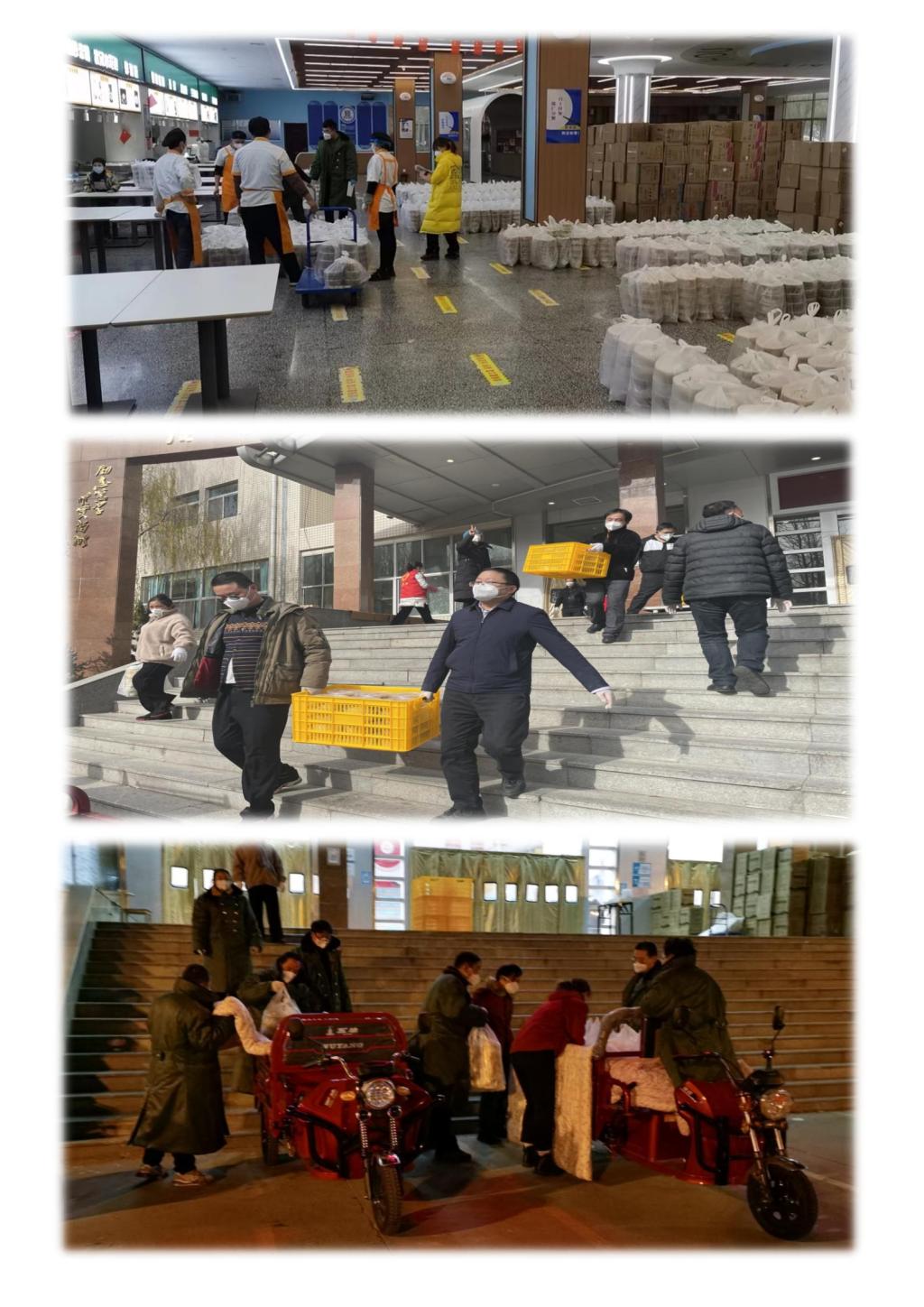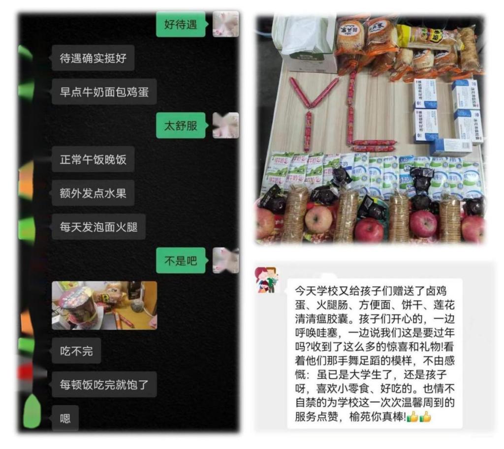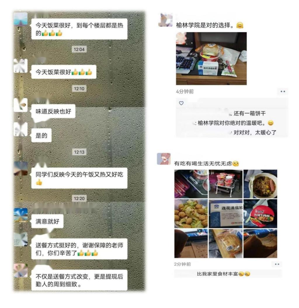 为了丰富饭菜种类,餐饮公司提供了套餐、水饺、面食、冒菜、汉堡等食品,但是由于进驻学生公寓的专班老师人数较少,餐食从餐厅送到学生手中需要较长时间,导致面食坨成一块,无法食用,针对这些问题后勤管理处立刻做出调整,配送饭菜以干货为主。然后屋漏偏逢下雨,榆林市气温突降到零下十度以下,主管后勤校领导连夜组织召开会议商讨出餐配送方案,经过大家连续奋战,终于保障了师生们在严冬依然能及时吃到热饭热菜,同时避免了物资的浪费。
