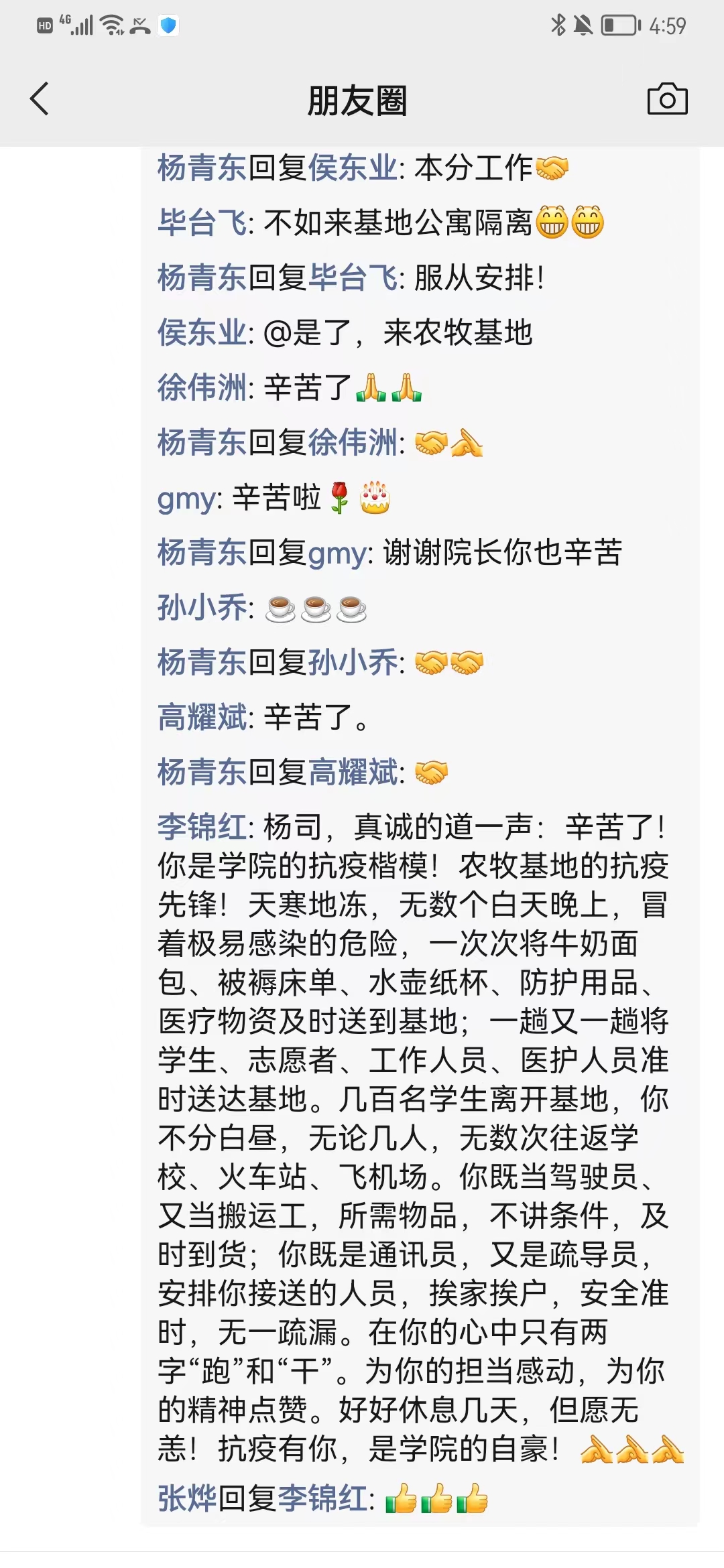 每次疫情他都像惊涛骇浪中的摆渡者,将同学们运送到安全的彼岸,将学校需要的医护队和各种物资接回来。虽然始终战斗在抗疫的最前沿,但他从没有退缩过,面对风险总是挺身而出,用实干苦干彰显了学院人的力量和担当。