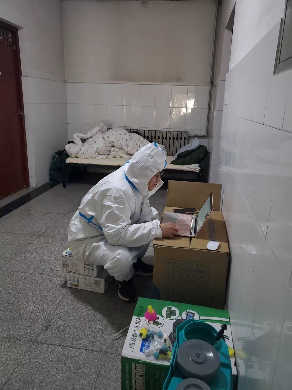 进驻公寓期间,在读博士杨雨佳迎来重要的博士学业考试。面对困难,他二话不说,以纸箱为凳桌,穿着防护服,用借来的笔记本完成了线上笔试和口试汇报。此外,杨雨佳还在千头万绪的工作间隙完成了榆林市重点实验室线上答辩以及beat365英国官方网站艺术教育年度报告文字材料。