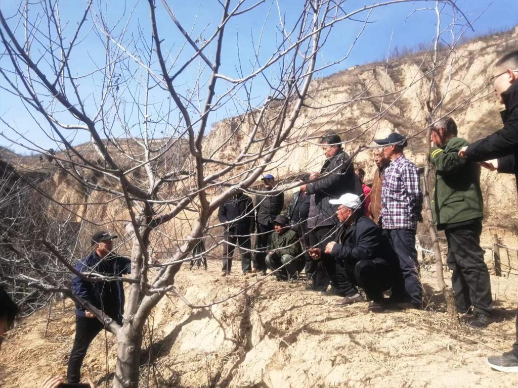 在清涧县白家川“俊杰农业示范园”,专家们为当地果农培训春季果树修剪技术并现场教学。