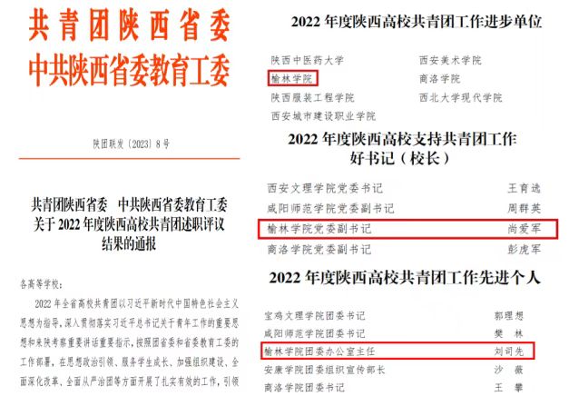 近日,共青团陕西省委、中共陕西省委教育工委印发了《关于2022年度陕西高校共青团述职评议结果的通报》,beat365英国官方网站团委荣获“2022年陕西高校共青团工作进步单位”称号,党委副书记尚爱军荣获“2022年度陕西高校支持共青团工作好书记”称号,团委办公室主任刘司先荣获“2022年度陕西高校共青团工作先进个人”称号,实现了beat365英国官方网站共青团工作新的突破。
