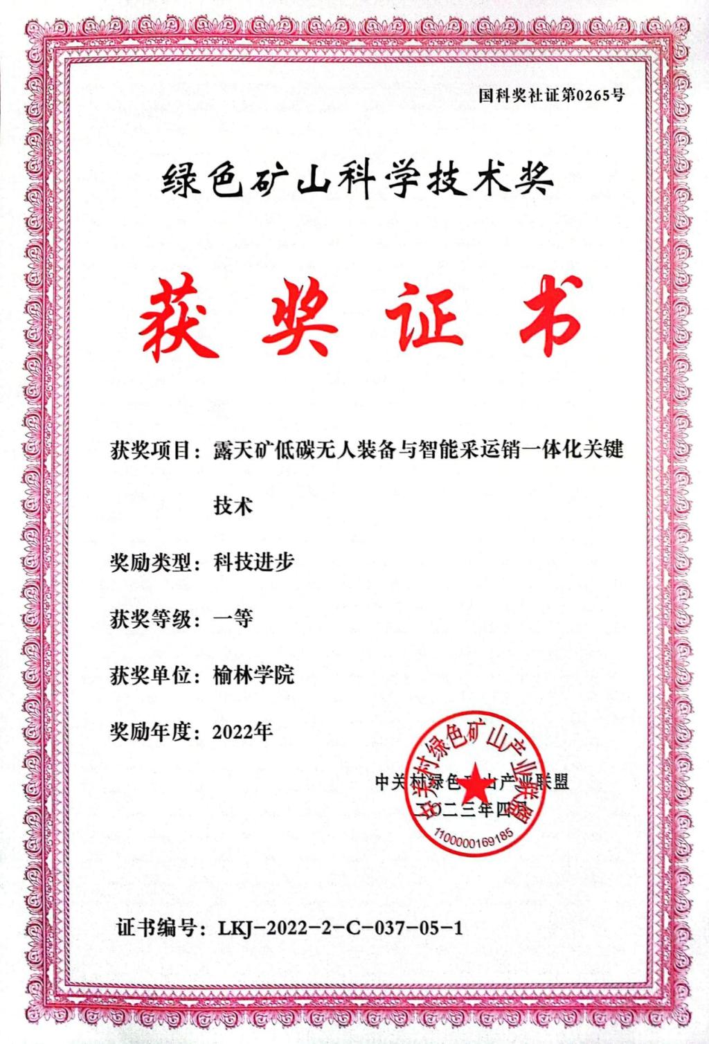 绿色矿山科学技术奖是2015年科技部国家科学技术奖励办公室批准中绿盟设立、国家奖励办备案的社会力量奖,目的是为表彰在绿色矿山创建中做出贡献的单位和个人,包含基础研究类、发明专利类、科技进步类等,是该领域具有影响力和代表性的科技奖励。2022年度共授奖158项,其中一等奖38项,二等奖63项 ,三等奖57项。