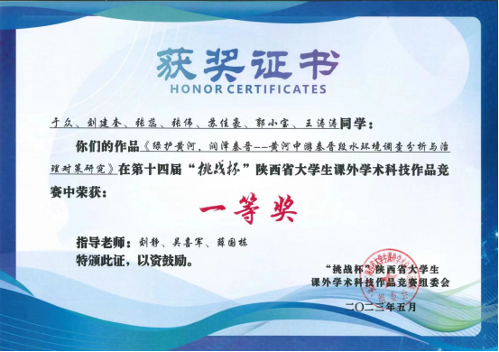 本届大赛自启动以来,校领导高度重视,校团委精心组织,各二级学院、各团总支(分团委)广泛动员、协作推进。经过立项申报、专题培训、初赛评审、决赛答辩、终审答辩等阶段,共收到113件立项申报作品,其中哲学社会科学类53件、科学发明制作A类13件、B类43件、自然科学学术论文43件。根据专家评审意见,最终遴选出13件作品参加省赛,3项作品获得省级奖项。其中,由建筑工程学院刘静、吴喜军、薛国栋老师指导,于众、刘建奎、张蕊、张伟、苏佳豪、郭小宝、王涛涛等同学负责的《绿护黄河,润泽秦晋——黄河中游秦晋段水环境调查分析与治理对策研究》荣获一等奖;由能源工程学院任立庆、李国杰、胡广涛老师指导,魏文斌、苗烨、孙健涛、姬超燃、李京羽、唐瑞凤、崔欣悦、杨玉鑫等同学负责的《高分辨太赫兹CARS肿瘤检测仪》荣获二等奖;由化学与化工学院张岩、高平强、高金强老师指导,王怡钰、时爽、胡清丽、吴慧召、张珍、曹旭、苏昱博、冯昊哲等同学负责的《净水源水体修复剂》荣获三等奖。