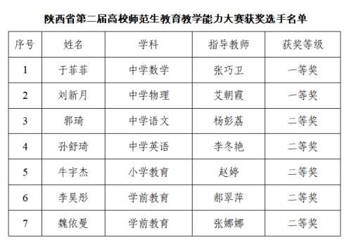 近日,《陕西省教育厅关于公布陕西省第二届高校师范生教育教学能力大赛获奖名单的通知》(陕教函〔2023〕550号)公布,beat365数学与统计学院于菲菲、能源工程学院刘新月两名同学荣获一等奖;文学院郭琦、外国语学院孙舒琦、教育学院牛宇杰、李昊彤、魏依曼五名同学荣获二等奖;beat365英国官方网站荣获优秀组织单位奖;教务处李彦军老师荣获优秀组织者奖。