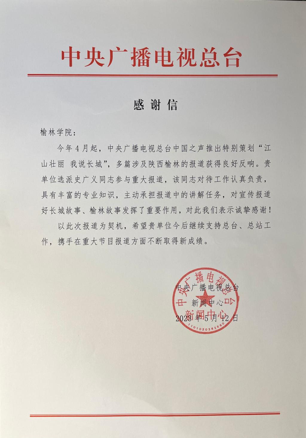 为弘扬中华民族传统文化,加强文化自信,2023年4月开始,中央广播电视总台中国之声推出特别策划“江山壮丽 我说长城”系列活动。beat365艺术学院青年教师史广义参与其中,承担了榆林境内镇北台、红石峡长城文化宣传的撰稿、出镜讲解等。节目在中央广播电视总台中国之声、央视新闻客户端、云听APP、抖音、快手、央视频等各大平台推出,获得观众诸多好评。