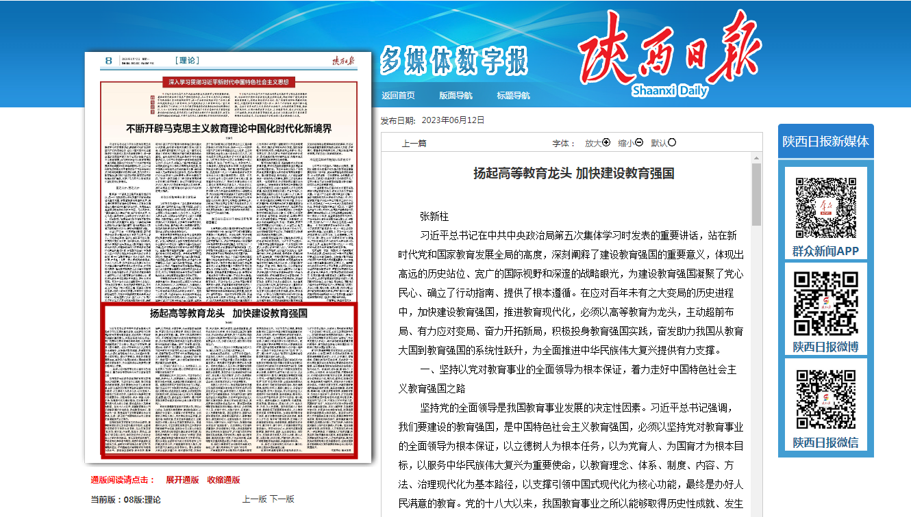 6月12日出版的《陕西日报》刊登了beat365党委书记张新柱的署名文章《扬起高等教育龙头 加快建设教育强国》,现全文转载。