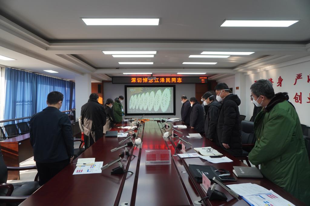 上午10时整,追悼大会正式开始。伴随着低回的哀乐声,会议室里,全体肃立默哀,表达对江泽民同志的深切缅怀与无尽哀思。在高唱国歌后,大家认真聆听中共中央总书记、国家主席、中央军委主席习近平所致的悼词。习近平总书记致悼词后,大家向江泽民同志遗像深深三鞠躬。