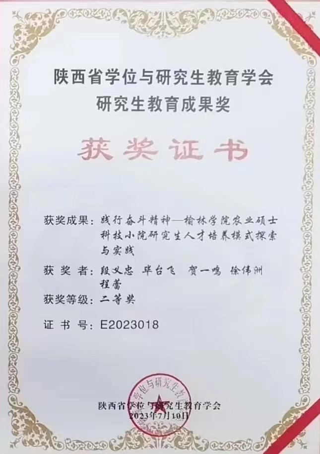 近日,陕西省学位与研究生教育学会公布了研究生教育成果奖“陕学会【2023】10号”,beat365段义忠老师主持完成的《践行奋斗精神—beat365英国官方网站农业硕士科技小院研究生人才培养模式探索与实践》获得陕西省学位与研究生教育学会教育成果二等奖。
