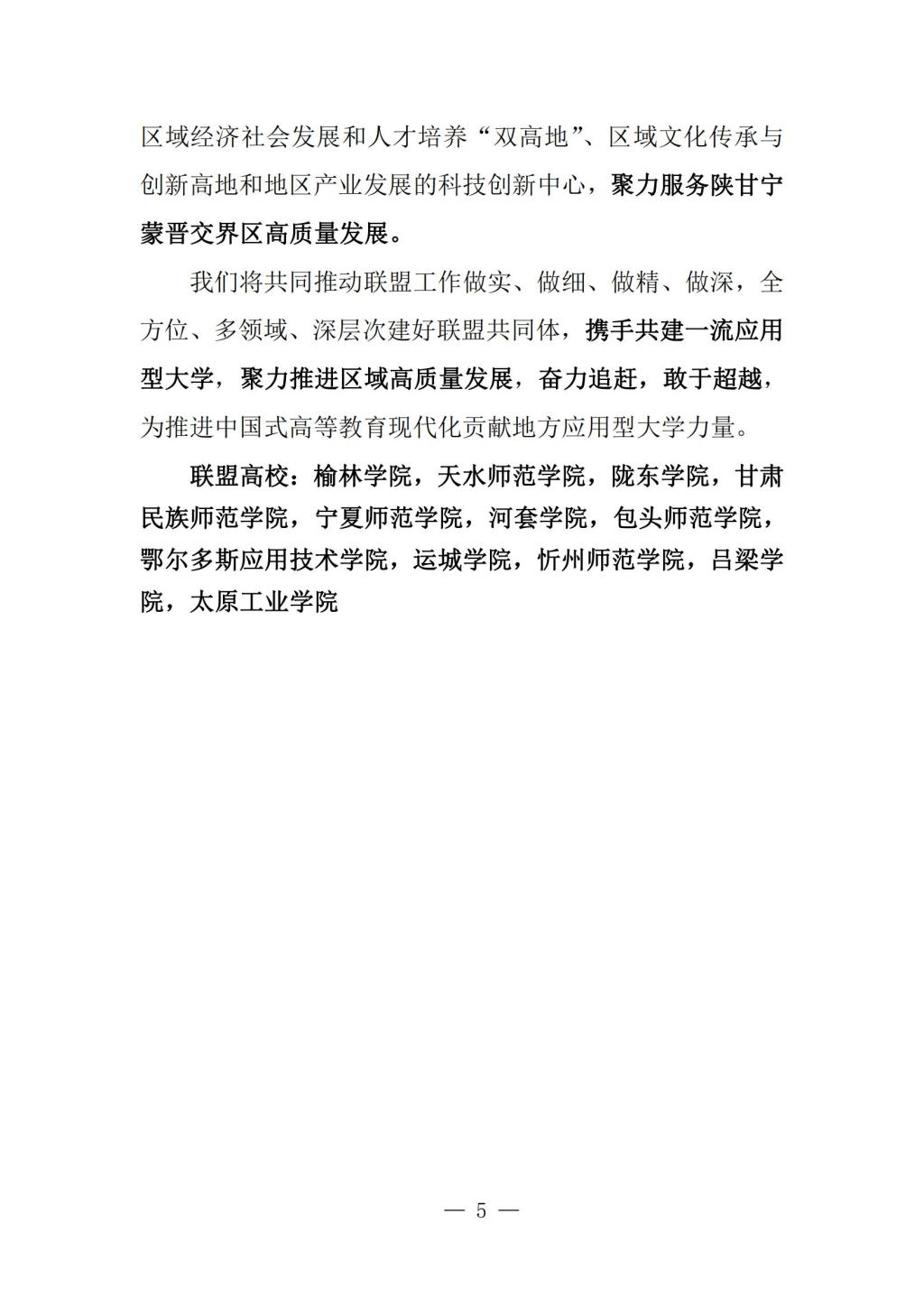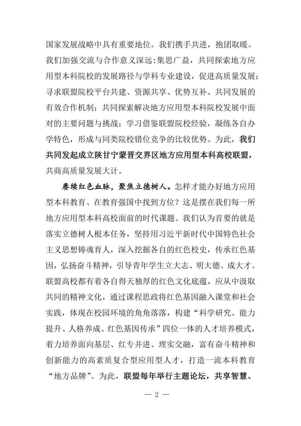 经2023年7月21日“陕甘宁蒙晋交界区地方应用型本科高校联盟”成立预备会暨第一届理事会第一次会议讨论,达成了符合联盟建设与发展的《榆林共识》,现予以发布: