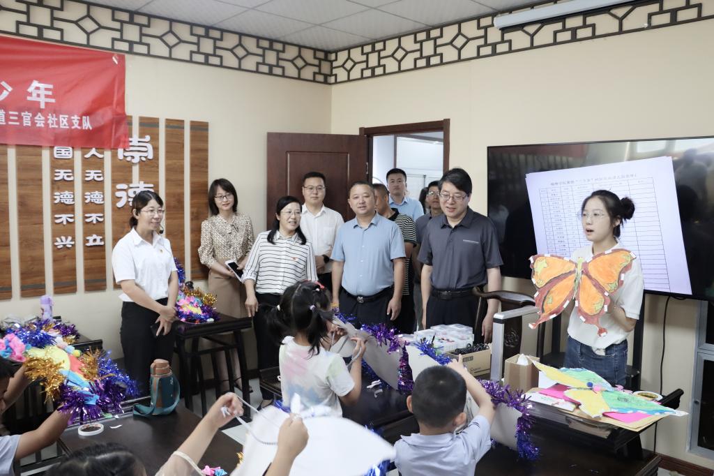 在三官会社区,党支部书记刘俊梅向张新柱一行介绍了三官会社区基本情况,社区开展的12345工作法、五色服务及新时代文明实践站工作情况。张新柱一行人深入课堂、体验课堂教学、观看心理团辅活动并与学生互动交流。随后进行了座谈交流,团榆阳区委书记张悦、榆林市青少年社工协会会长张旺,新明楼街道办事处主任肖容参加。