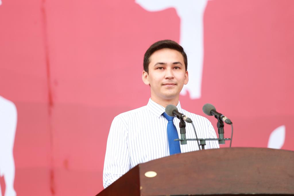 留学生代表来自乌兹别克斯坦的SANJAR ISAEV(中文名字:潘越)同学发言