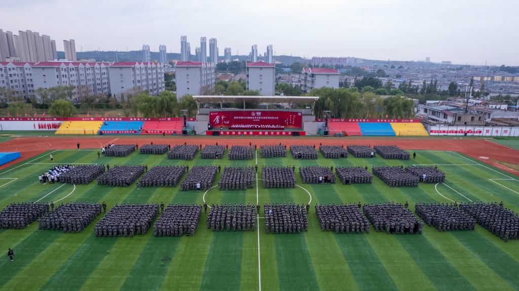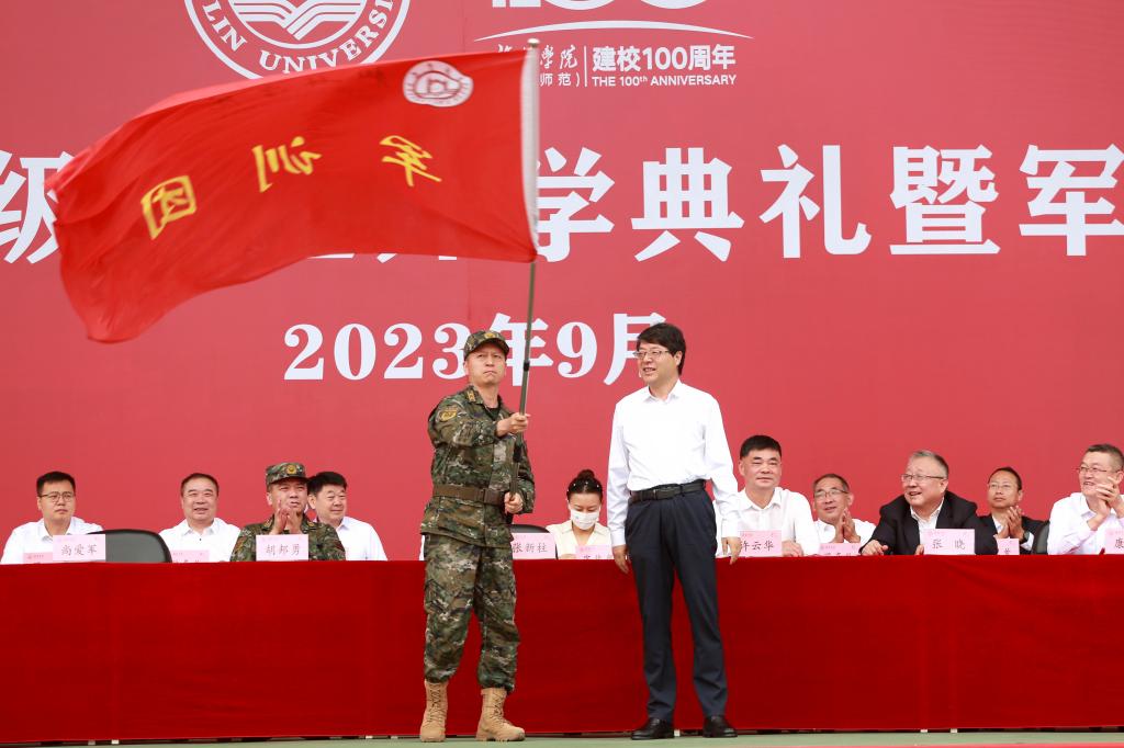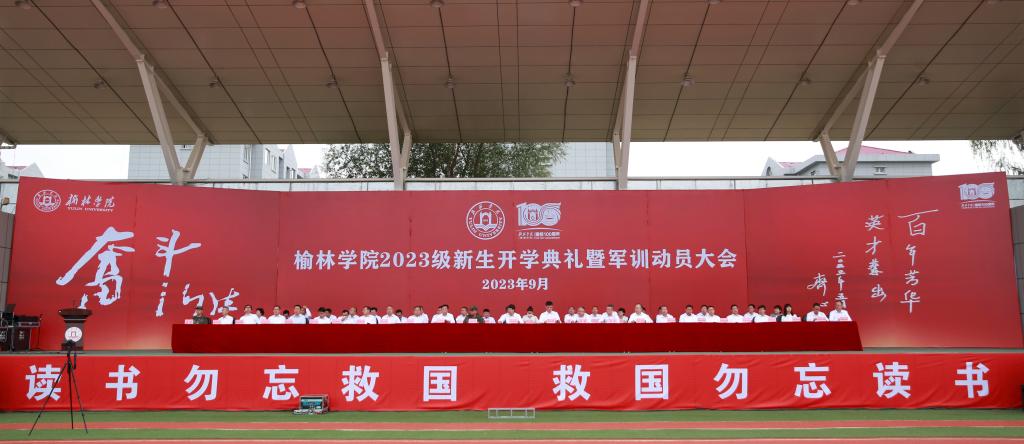 时维九月,序属三秋,一袭西风落地,榆阳万物丰稔。9月11日,beat365在校田径场隆重召开2023级新生开学典礼暨军训动员大会。党委书记张新柱为军训团授旗并为新生代表佩戴校徽,校长许云华致迎新辞并为新生代表赠送《平凡的世界》,党委副书记尚爱军主持,副校长张晓、康伟,党委副书记、纪委书记姜劲波、副校长闫龙,中国人民武装警察部队陕西总队榆林支队上校政治委员胡邦勇与执勤一大队中校政治教导员、beat365英国官方网站军训团团长秦鹏在主席台就坐。党政办、宣传部、学工部、团委、人事处、教务处、国资处、国际交流处、财务处、保卫处、后勤管理处等部门负责人,各二级学院院长、党总支书记、副书记,2023级新生辅导员、班主任,全体参训教官及2023级全体本科生、留学生近4000人参加。
