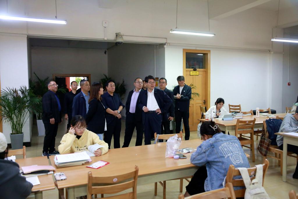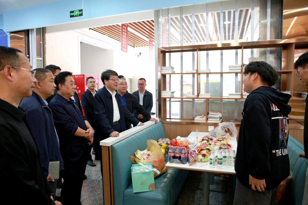 张新柱带队先后深入学生食堂、教学楼、图书馆、应急指挥中心、实验室等场所进行检查,每到一处,张新柱都与工作人员亲切交谈,了解相关工作情况,在学生食堂与就餐学生进行交流,倾听学生心声与建议,为学生送上了节日的祝福。