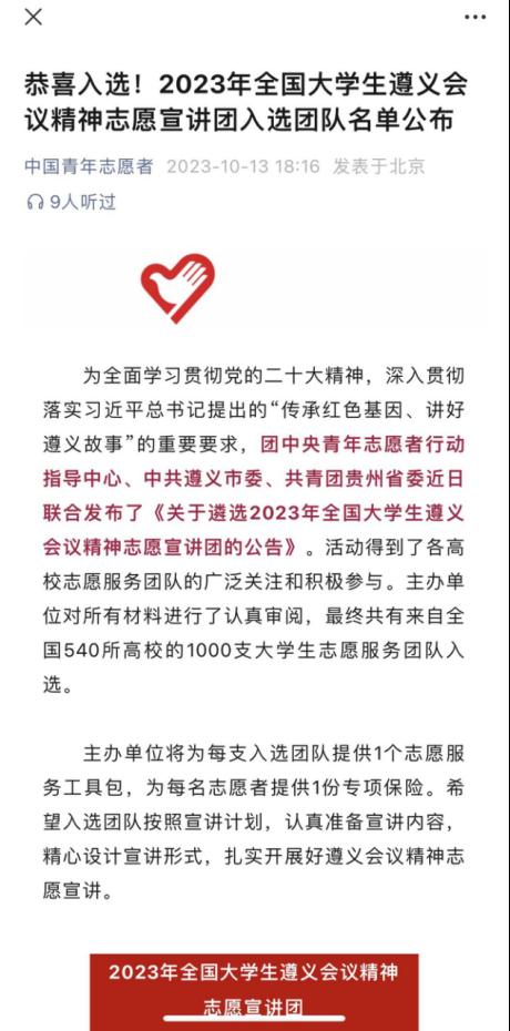 为全面学习贯彻党的二十大精神,深入贯彻落实习近平总书记提出的“传承红色基因、讲好遵义故事”的重要要求,团中央青年志愿者行动指导中心、中共遵义市委、共青团贵州省委近日联合发布了《关于遴选2023年全国大学生遵义会议精神志愿宣讲团的公告》。经过前期的广泛动员、选拔、申报,beat365英国官方网站大学生“励志”宣讲团成功入选全国1000支大学生志愿服务团队榜单。