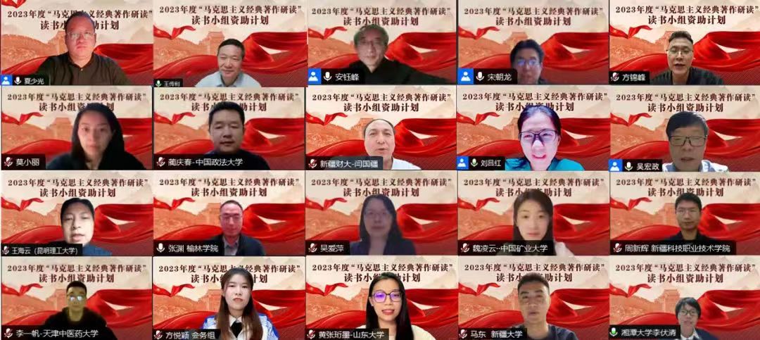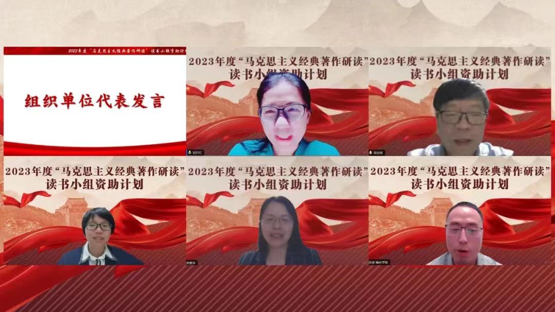 2023年11月4日晚,马研会2023年度“马克思主义经典著作研读”读书小组资助计划启动大会在线上顺利举行。北京大学校务委员会副主任兼秘书长、北京大学工会主席、马研会理事长安钰峰,深圳桃李未来教育集团董事长方锦峰,清华大学马克思主义学院教授、马研会副理事长王传利出席会议并致辞。马研会副理事长刘吕红、吴宏政,常务理事吴爱萍、张渊,理事王海云、莫小丽等出席会议并发言。北京大学马克思主义学院副院长、马研会秘书长宋朝龙出席会议。大会由马研会副秘书长夏少光主持。启动会上,研会理事长安钰峰、深圳桃李未来教育集团董事长方锦峰、清华大学马克思主义学院教授、马研会副理事长王传利等嘉宾致辞,北京大学马克思主义学院副院长、马研会秘书长宋朝龙代表主办单位作总结发言。