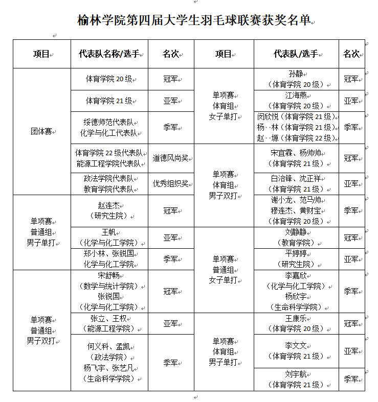 本次比赛各二级学院共组建20支代表队,近400余名学生参加,设立男双、女单、男单三个单项赛和混合团体赛,采用国际羽联最新审定的羽毛球竞赛规则。参赛队员本着“友谊第一、比赛第二”的原则,全情投入,以饱满的竞技状态和永不服输的体育精神奋力拼搏,“好球”“妙球”接连不断,“点杀”“封网”“劈吊”“扑救”等精彩场面不断上演,每一个回合都是智慧与力量的较量,呈现了一场场精彩的视觉盛宴,展现出beat365学生昂扬向上的精神风貌。经过三天激烈的角逐,最终体育学院20级代表队荣获团体赛冠军、体育学院21级代表队荣获团体赛亚军,绥德师范学院、化学与化工学院代表队荣获团体赛季军;单项赛同样精彩纷呈,在运动员的努力拼搏下,孙静、刘静静荣获女子单打冠军,江海燕、平婷婷荣获亚军,闵欣悦、李嘉欣、杨欣宇等荣获季军;宋宜霖、杨帅帅,沈正祥、白治锋,谢小龙、范马帅等凭借默契的配合,在男子双打中脱颖而出,分别荣获冠军、亚军、季军;王康乐、李文文、刘宇航等同学分别荣获男子单打比赛的冠、亚、季军;体育学院22级代表队、能源工程学院代表队荣获道德风尚奖;政法学院代表队、教育学院代表队荣获优秀组织奖。