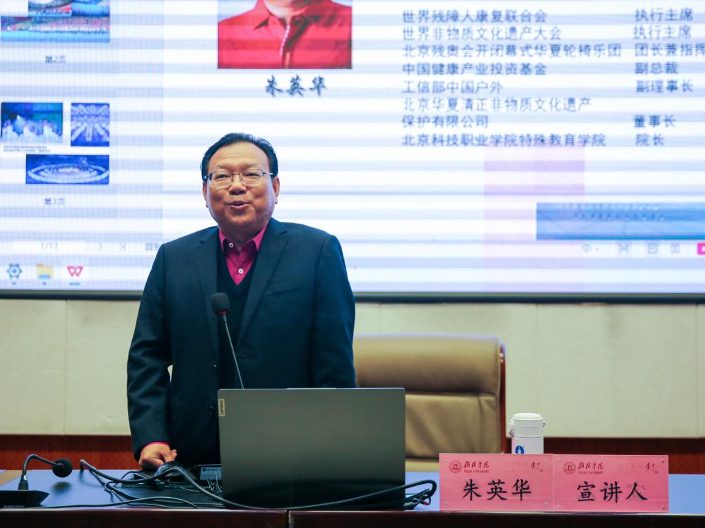 朱英华为同学们讲述了自己2岁时因疾病导致左腿残疾。凭借坚定的意志,他不仅战胜了一个个困难,还创建了特殊教育学院,帮助更多的残疾人勇敢绽放自己,给缺憾的身体添上翅膀,在平凡的生活中奏出了不平凡的人生强音,用实际行动书写了“奋斗与大爱无疆”。