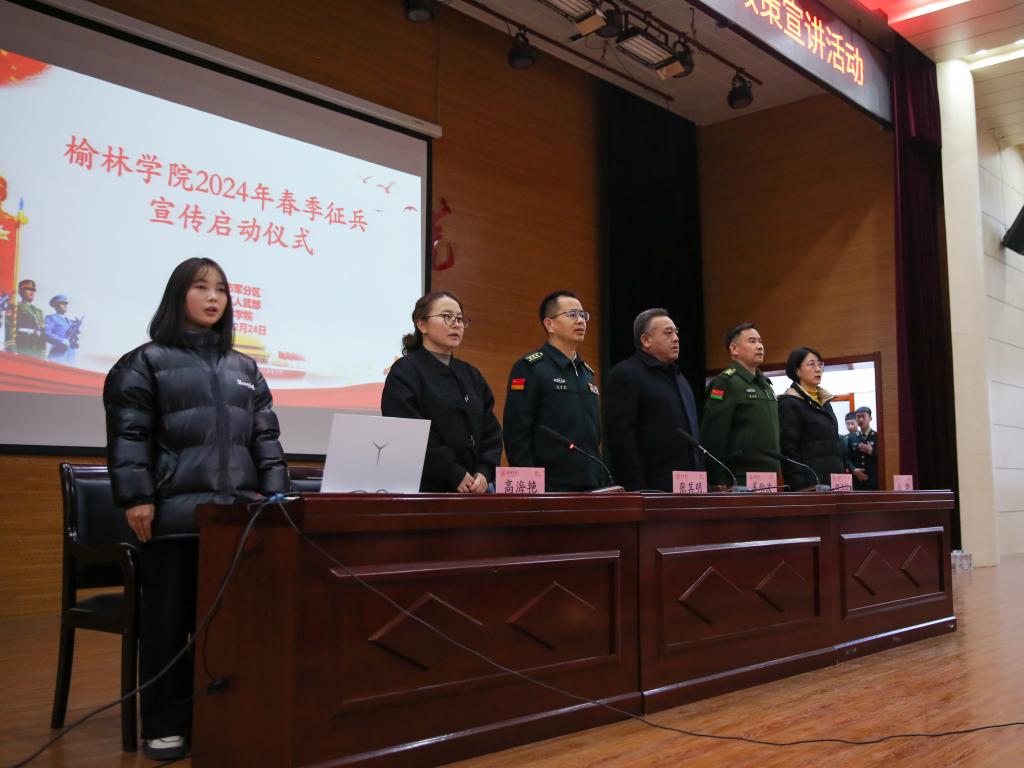 11月24日下午,beat365英国官方网站2024年春季征兵宣传月暨大学生应征入伍政策宣讲活动启动仪式在图书馆学术报告厅圆满举行。榆林军分区战备建设处上校处长张其明、榆阳区人武部上校政委田玉海应邀参会,beat365英国官方网站党委副书记、纪委书记、监察专员姜劲波出席并作重要讲话。参加本次大会的还有招就处负责人、研究生院党总支书记、各二级学院党总支书记、副书记,2020级辅导员班主任及学生代表。