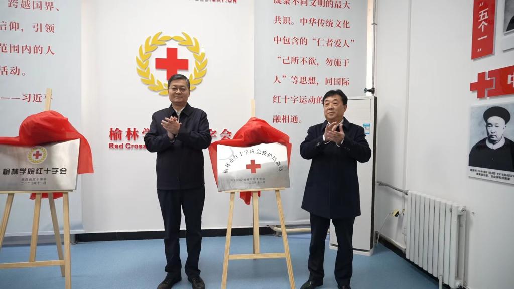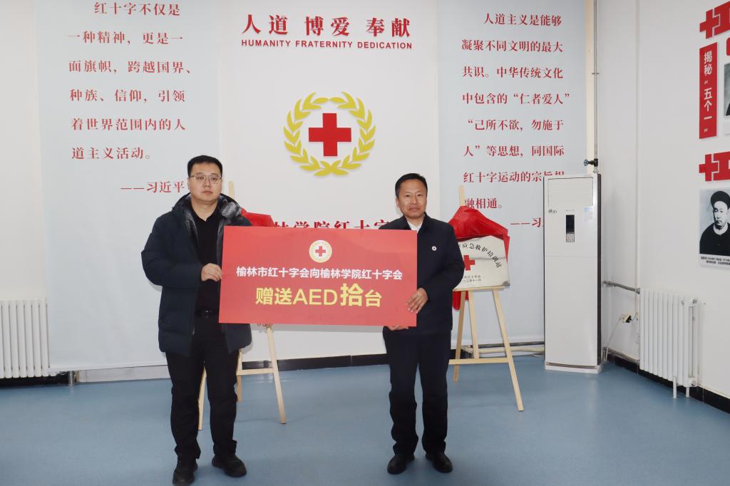 陕西省红十字会党组书记、常务副会长兰孟偃、beat365英国官方网站党委书记张新柱共同为beat365英国官方网站红十字会揭牌,榆林市委副书记李雄斌、校党委副书记尚爱军为“榆林市红十字应急救护培训站”揭牌,榆林市红十字会党组书记、常务副会长李剑为beat365捐赠AED10台。