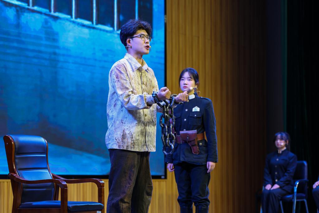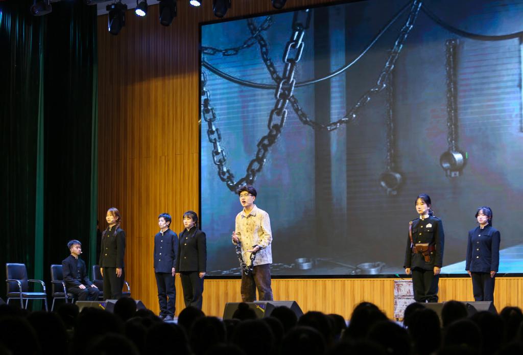 之后,师生共同观看了原创红色话剧《李子洲在1929》,本剧于2021年在北京、西安展演获得成功,并入选教育部2022年"高校原创文化精品推广行动计划",获2021年度榆林市重大文化精品项目资助。现作为学校入学教育三部曲之一,全部由学生出演。1500多名师生在重温英雄风云历史中体验舞台话剧的艺术魅力,话剧情节紧凑跌宕,人物形象立体丰满,真情出演催人泪下,台下师生们无不眼含热泪,掌声不断。
