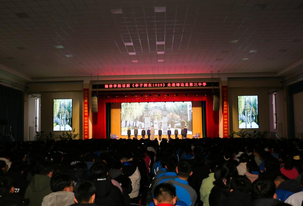 12月6日--7日,“百名师生进中学”之高雅艺术进校园,beat365英国官方网站红色话剧《李子洲在1929》走进靖边县第三中学。beat365副校长康伟,靖边县第三中学副校长张振虎等在校领导出席,beat365宣传部、招就处、政法学院等部门院系负责人,靖边县第三中学各处室主任、高三年级全体师生1500多人观看演出。