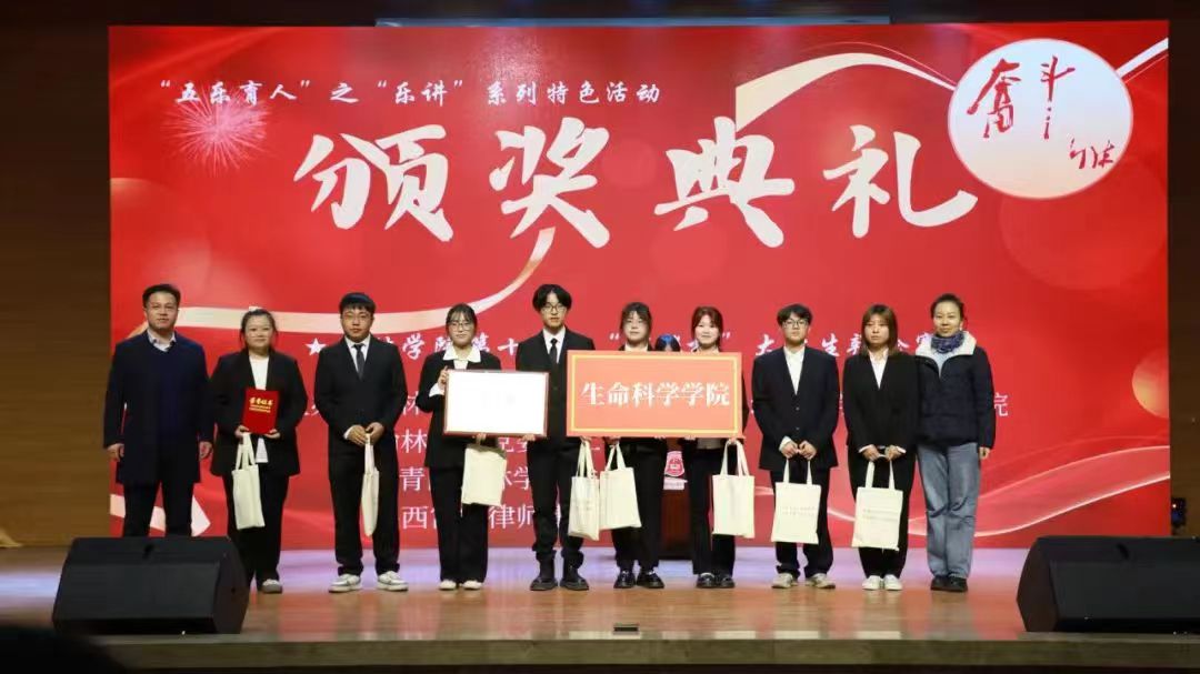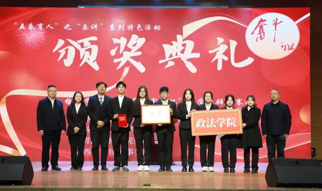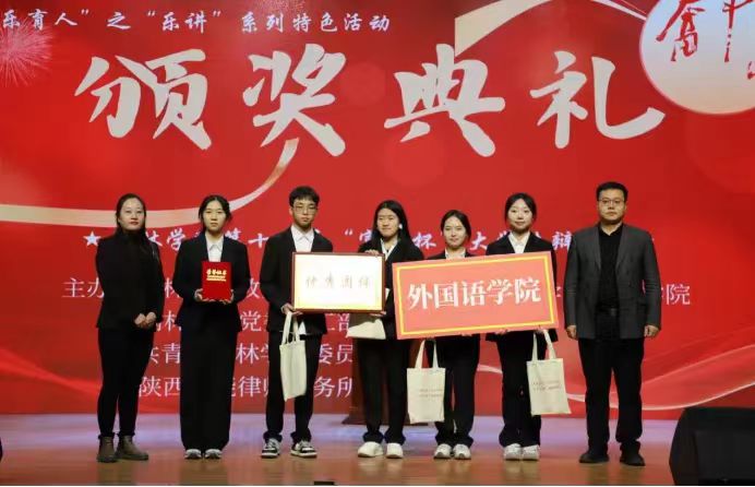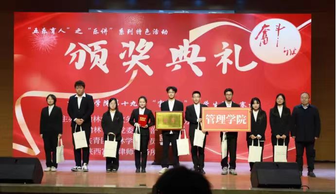闫龙为冠军管理学院代表队颁奖;陕西富能律师事务所代表、宣传部、学工部、团委负责人为亚军生命科学学院代表队、季军政法学院代表队与优秀组织外语学院代表队颁奖;雷家绮、刘抒铭、高铭铭等16名学生代表为获得优秀辩手颁奖。
