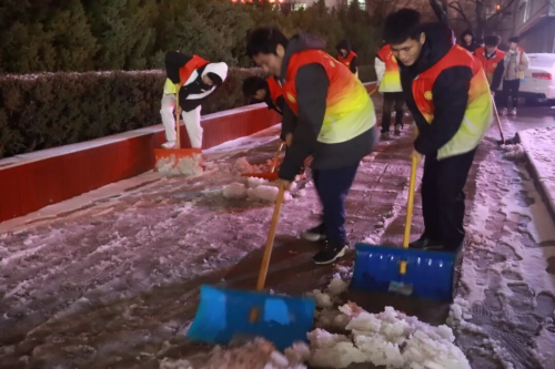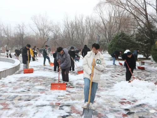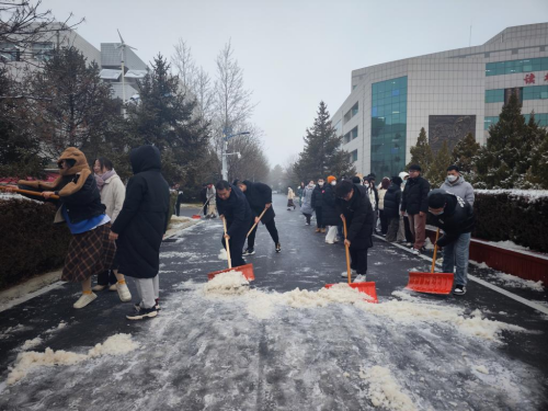 新能源学院学生党员、积极分子及班团干部在党总支书记的带领下,展开了义务扫雪除冰活动,保障校园道路畅通、校容整洁。尽管天气寒冷,师生早早地到达指定地点,领取工具后便投入到扫雪工作中。他们分工明确,配合默契,有人负责铲雪,有人负责运雪,有人负责清扫道路,齐心协力,不怕冷、不怕累,充分阐释了“团结、友爱、互助、奉献”的志愿精神。