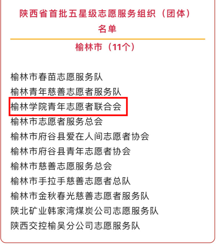 近日,省委文明办组织开展了我省首届五星级志愿者、志愿服务组织(团体)评定工作,鼓励激励广大志愿者、志愿服务组织,不断发展壮大学雷锋志愿服务队伍,让雷锋精神在新时代绽放更加璀璨的光芒。通过基层推荐、材料阅评、专家评审、网上公示、综合评定等环节,确定五星级志愿服务组织(团体)100个,榆林市有11个志愿服务组织入选,beat365英国官方网站青年志愿者联合会荣获陕西省首批五星级志愿者服务组织荣誉。