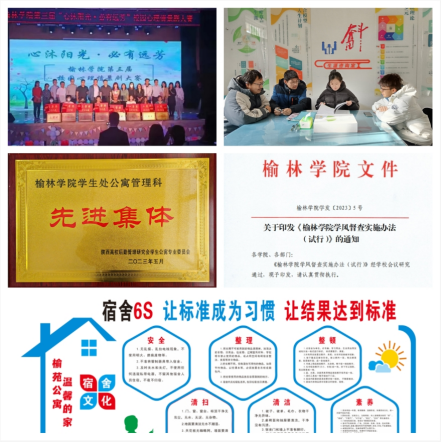 (四)创新模式,公寓建设不断加强。全面推进“一站式”学生社区建设,落实党建引领、阵地建设、队伍进驻、服务下沉和文化浸润五项重点任务,打造党团活动室、心理驿站、职业创业指导室、少数民族学生工作室、国防教育工作室育人阵地,全方位满足学生成长需求。不断完善学生社区基础设施,着力加强学生社区文化建设,持续开展宿舍文化节、文明宿舍评比活动,充分发挥学生社区在思政教育中的前沿阵地作用。大力推行“6S管理”模式,认真执行学生宿舍安全、内务卫生达标、宿舍学风建设等公寓管理制度,出台《beat365英国官方网站学生公寓禁烟管理规定》。加强学生宿舍管理工作人员业务培训,不断提升管理水平和服务质量。学校党政、学工干部践行一线规则,扎实开展“走进社区问需求,畅谈平凡话奋斗”活动,指引学生奋斗之路,补足学生精神之钙。五年来,beat365公寓管理服务工作成绩突出,2次荣获陕西高校学生公寓先进集体,4人分别被授予“陕西高校学生公寓服务标兵”和“陕西高校学生公寓优秀员工”荣誉称号。