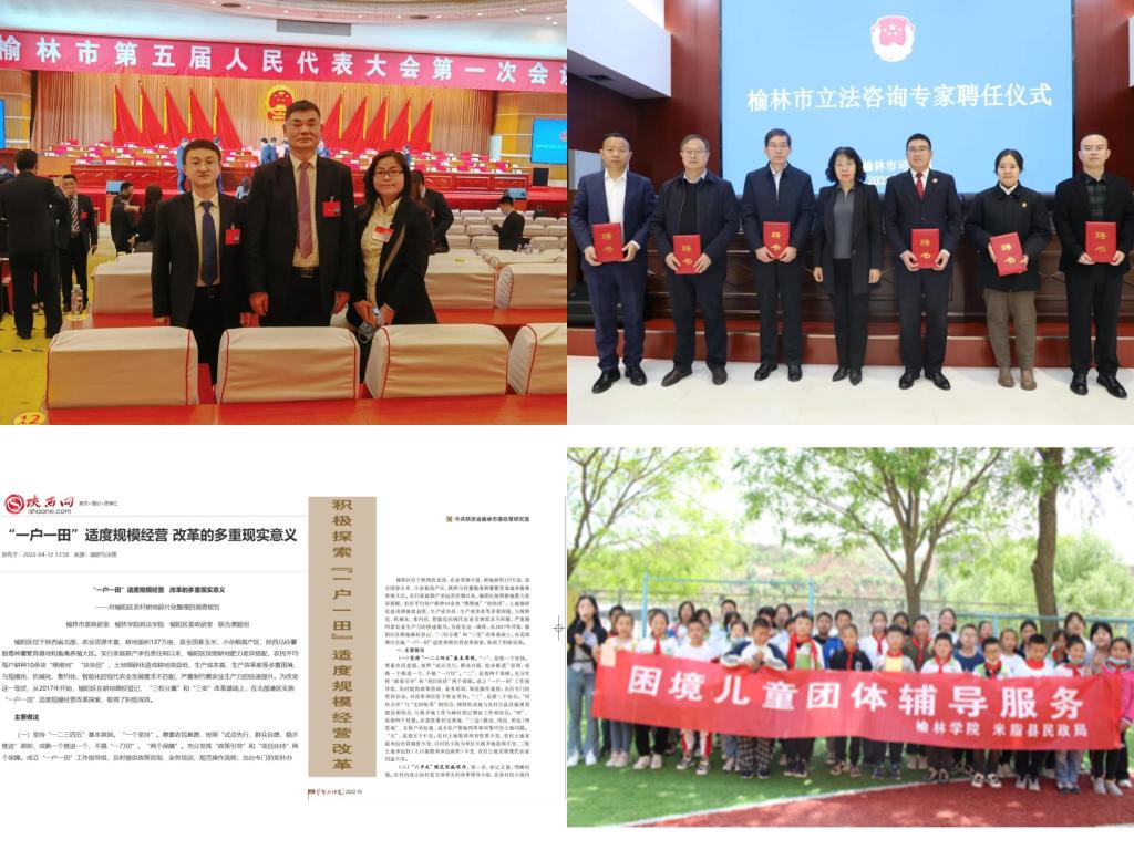 学院始终把发挥专业优势、服务社会发展作为重要政治任务。主动对接榆林市发展需求,围绕法治建设、基层治理和社会服务充分发挥学科、人才和科研优势。法学专业教工党支部7名教师担任兼职律师,2名教师兼职榆林市仲裁委员,4名教师入选榆林市法治人才库专家。司雪侠教授当选为第五届榆林市人大代表,史丕功教授被聘为榆林市司法局立法咨询专家。与榆林市检察院、法院、司法局、北京盈科律师事务所、陕西富能律师事务所等多家单位深入合作。社工教工党支部书记邱韵副教授成为陕西省首批社会工作专业督导人才,与榆阳区民政局、米脂县民政局、榆林市未成年人救助保护中心等部门合作,开展困境儿童调研与能力提升研究,到账经费达到120万。李海宝副教授牵头形成社会治理与公共政策评估研究团队,开展城乡基层社会治理模式及国家级高标准农田示范区对策研究,研究成果《榆林市“一户一田”适度规模经营改革研究》,先后被省委内刊《调研与决策》和中央内刊《学习与研究》编辑刊登,在榆林市范围内广泛运用。依托榆林市慈善文化研究中心,构建慈善文化品牌,连续三年获陕西省慈善文化进校园项目一等奖、二等奖。依托榆林法治文化研究中心,构建法治文化品牌,“送法下乡”项目获得“互联网+”青年红色筑梦之旅赛道陕西省铜奖。依托社会工作专业,构建青少年社会工作品牌,“青苗守护计划”项目获“互联网+”大赛陕西省三等奖。