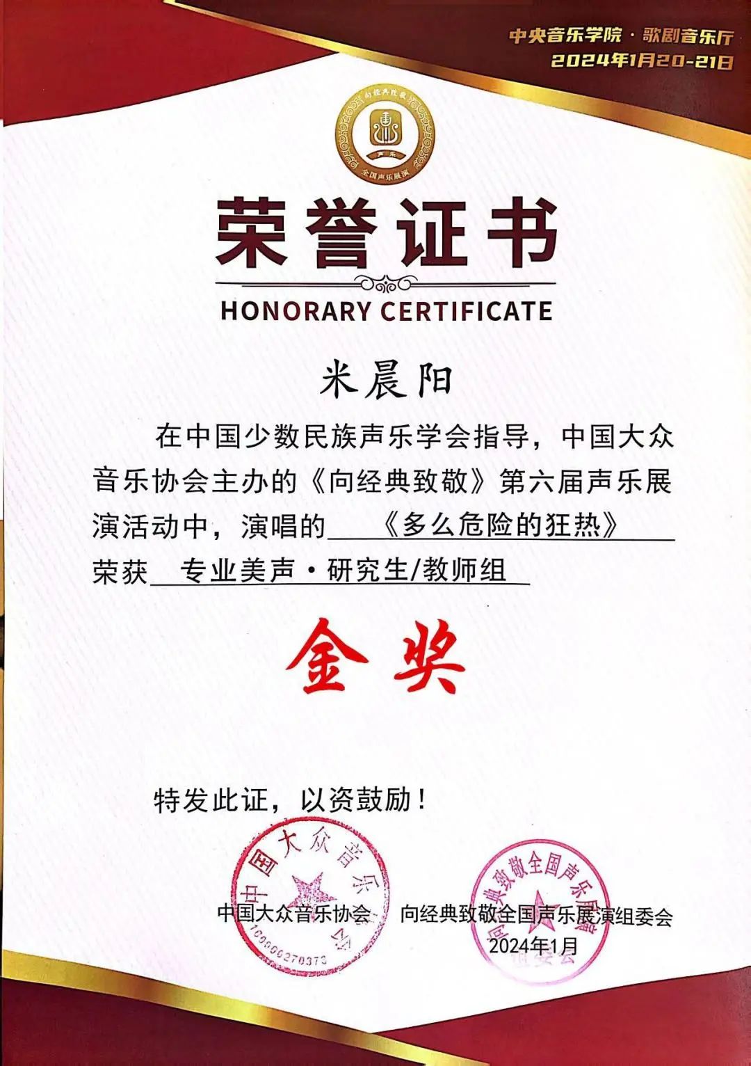 1月20日,由中国大众音乐协会主办,向经典致敬声乐展演组委会和中国大众音乐协会主办、中国少数民族声乐学会支持的“向经典致敬”第六届全国声乐展演活动在北京中央音乐学院歌剧音乐厅举办。beat365青年教师米晨阳以高亢激昂的嗓音,变化多样的唱腔,稳健大气的台风,经过海选、复赛、决赛的激烈角逐,最终以一首《多么危险的狂热》获得了评委组的一致好评,荣获专业美声·研究生/教师组金奖。