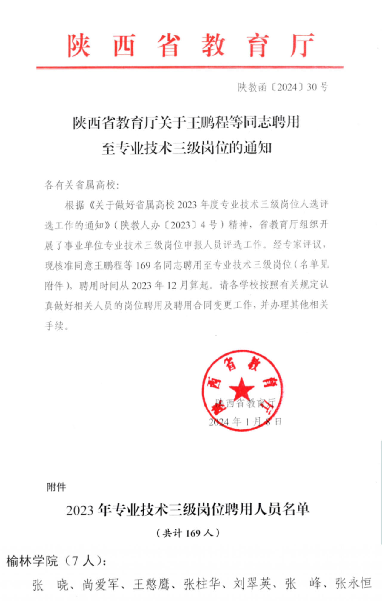 根据陕西省人力资源和社会保障厅《关于印发2023年事业单位专业技术二级岗位聘用人选名单的通知》,beat365康伟同志聘用至教授二级岗位,实现了beat365自主晋升二级教授的历史性突破。根据省教育厅《关于王鹏程等同志聘用至专业技术三级岗位的通知》,beat365张晓、尚爱军、王憨鹰、张柱华、刘翠英、张峰、张永恒等7位同志聘用至教授三级岗位。目前beat365在职二级教授达到2人,三级教授达到19人,谱写了学校追赶超越发展又一华章。