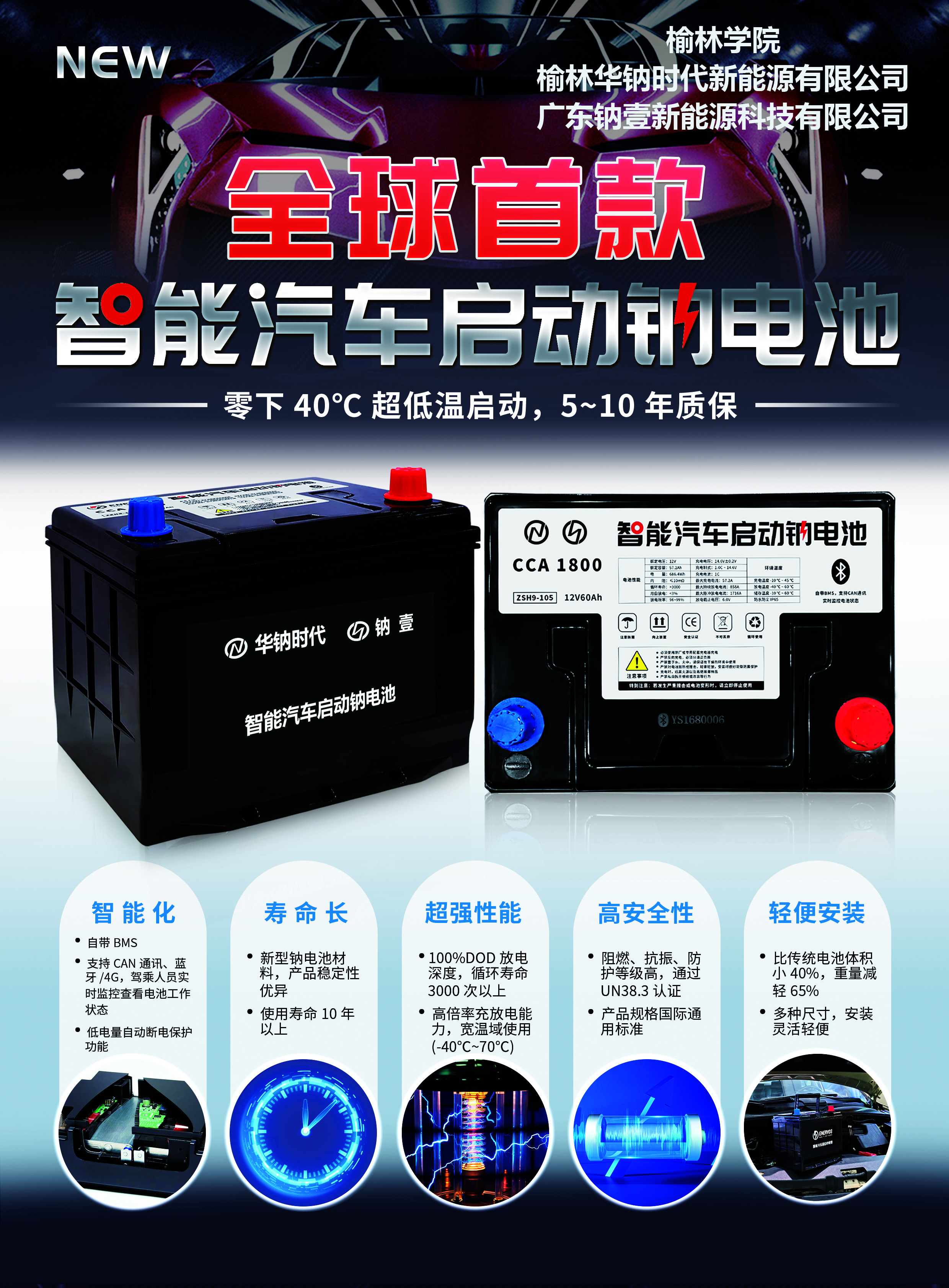 智能汽车启动钠电池是一款具有完全自主知识产权的全球首款智能汽车启动钠电池。相较于传统铅酸蓄电池储能密度低、使用寿命短和服役环境苛刻等问题,该产品具备智能化、寿命长、超强性能、超高安全性、低温性能优异、轻便安装等优势,可满足矿卡、运输汽车、工程机械车等对低温与性能的不同需求,具备极强的产业化能力和广阔的推广应用前景。