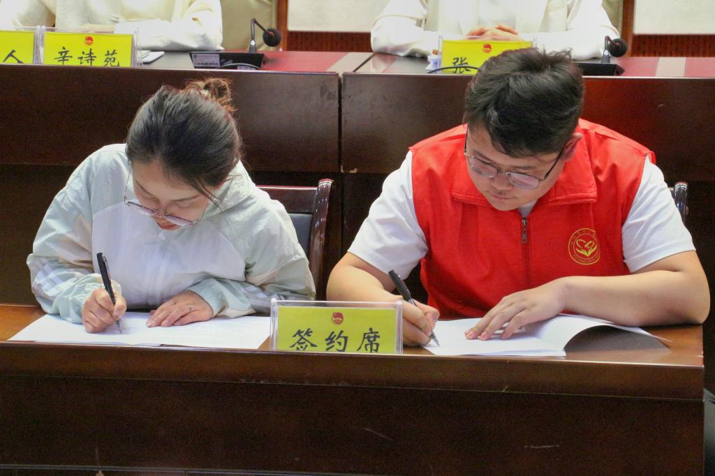 团榆阳区委、beat365英国官方网站团委签订了2024年校地协同创新协议;街道社区负责人与beat365二级学院团总支、青年志愿者服务队负责人现场签订了“最青春·社区”榆阳区团员青年进社区志愿服务协议书。beat365英国官方网站团委组织部部长刘媛媛作了大学生进社区经验分享。