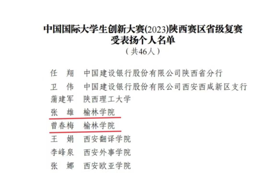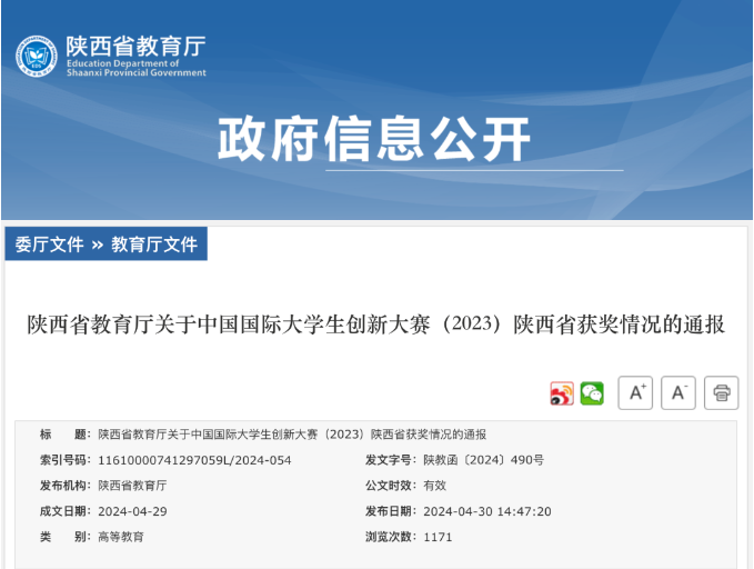 近日,为激励先进、树立典型,陕西省教育厅发布了《陕西省教育厅关于中国国际大学生创新大赛(2023)陕西省获奖情况的通报》,将我省中国国际大学生创新大赛(2023)国赛获奖情况予以通报,对陕西赛区省级复赛组织工作中表现突出的集体和个人进行通报表扬。