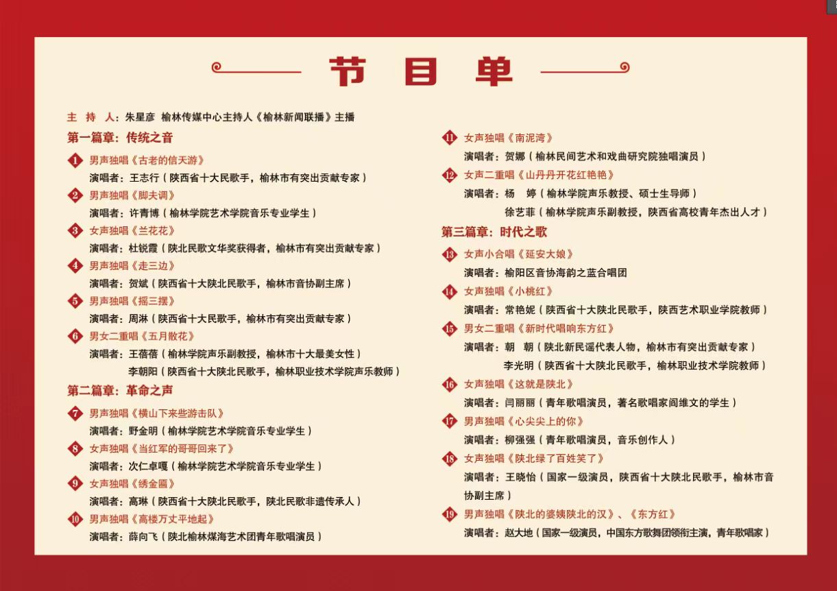 本次音乐会共分为传统之音、革命之声、时代之歌三个篇章。王志行演唱的《古老的信天游》,王蓓蓓和李朝阳演唱的《五月散花》,海韵之蓝合唱团演唱的《延安大娘》、杨婷和徐艺菲演唱的《山丹丹开花红艳艳》等传统民歌,有着鲜明的地域特色、浓郁的时代气息、充沛的情感表达和强烈的艺术感染力。经陕北民歌手和beat365师生的倾情演唱,艺术化地再现了陕北民歌植根民族文化沃土,在创造性转化和创新性发展中迈进新时代的历程。