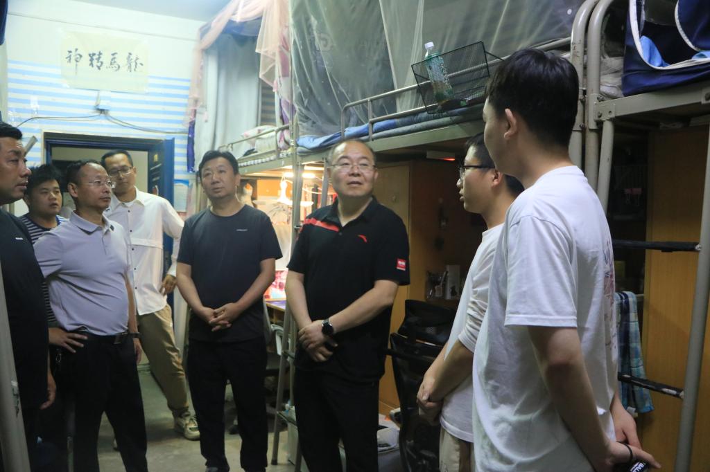 在学生宿舍,校领导与同学们亲切地拉家常、谈学习、聊生活,询问大家在学习和生活中有哪些困难和不便;了解大四毕业生就业去向、就业单位以及考研情况,对学校、学院有什么意见建议;提醒同学们要牢固树立健康生活的意识,按时熄灯休息,养成科学健康的生活习惯;要高度重视消防安全,不得麻痹大意,为了自己和他人的安全,严禁使用违规电器。走访中,校领导认真听取了学生处、保卫处负责人关于公寓消防安全、学生日常教育管理等工作汇报,检查了公寓消防通道、辅导员工作站值班情况、“跳蚤市场”开展情况和校园电动自行车充电桩安全设施。
