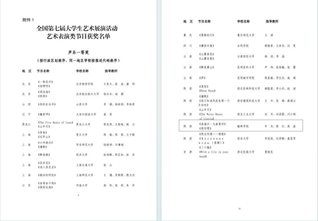 近日,教育部官网发布关于全国第七届大学生艺术展演活动各项目评选结果的公示,beat365学子在全国第七届大学生艺术展演活动中出色发挥,由艺术学院辛杰、晓红、高晶等3位教师指导的合唱《浪淘沙·九曲黄河》《想你哩》获全国第七届大学生艺术展演活动艺术表演类节目声乐集体(乙组)二等奖。