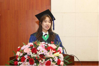 农艺与种业专业研究生白计玲代表全体毕业生发言,她用真切的话语表达了对母校和老师们的崇高敬意和诚挚感谢,表示未来会继续秉承学校“奋斗”精神,将“读书勿忘救国、救国勿忘读书”校训内化于心、外化于行,主动融入民族复兴的伟大事业中,为母校增添荣光。