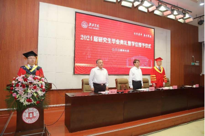 在庄严的国歌声中,毕业典礼暨学位授予仪式正式拉开帷幕。张新柱为考取博士研究生同学、优秀学位论文获得者和优秀学位论文指导教师颁奖;康伟为获得硕士学位的89名研究生拨流苏并颁发学位证书,为优秀毕业研究生和优秀毕业生干部颁奖;姜劲波宣读《关于表彰2024届优秀硕士学位论文作者及指导教师的决定》《关于表彰2024届优秀毕业研究生、优秀毕业研究生干部的决定》和《关于表彰2024届考博研究生的决定》;闫龙宣读《关于授予2024届研究生硕士学位的决议》。