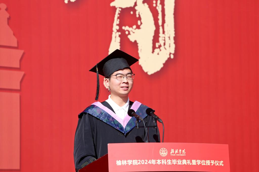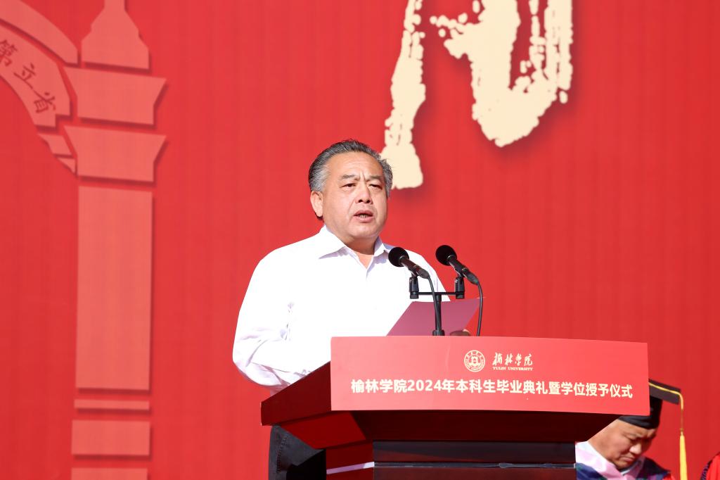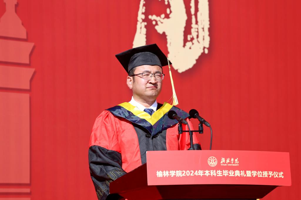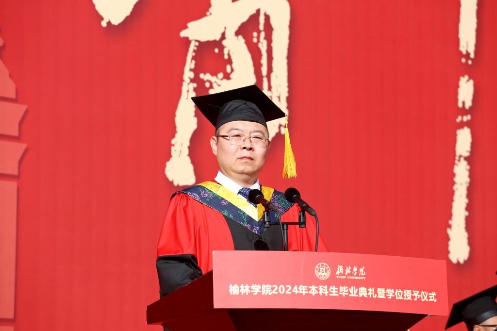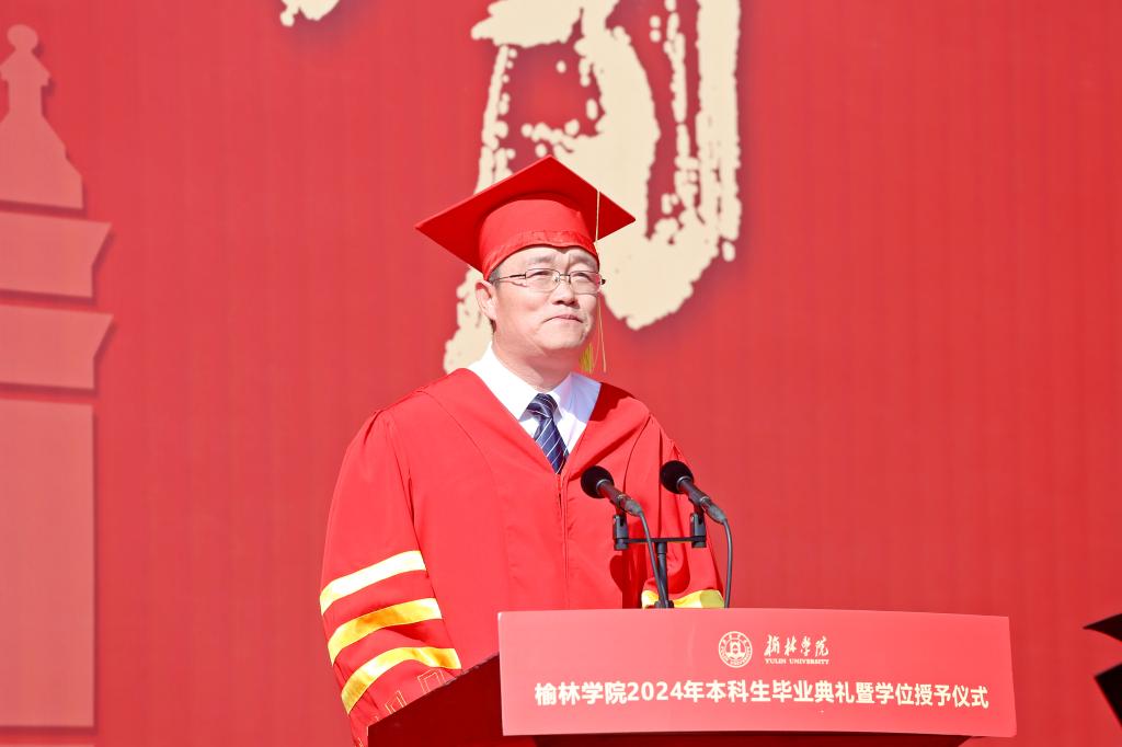 康伟代表学校向全体毕业生表示最热烈的祝贺,寄语毕业生:让奋斗成为我们坚定的传承。借用三首陕北民歌提出三点嘱托:一是唱响《东方红》,以丹心爱国家,铸牢读书报国的高远志向。唯有将个人发展融入到国家发展之中,扎根人民,人生道路才会有坚实的基础和正确的方向。希望同学们做一个有家国情怀的人,因为家国情怀将是你一生进步、进取不竭的动力。二是唱足《高楼万丈平地起》,以匠心铸精品,坚守拼搏奋斗的人生追求。“躺平”和“奋斗”是当今时代的两个网络热词,希望同学们记住,“躺平”绝不是奋斗者的姿态,也不是追求美好生活的人生态度。经过四年的学习,“奋斗”的精神已经流淌在你们的血液里,镌刻在你们的灵魂深处。理想的琴,只有拔动奋斗的弦,才能奏出人生美妙动听的乐章。三是唱亮《信天游》,以初心守正道,锤炼律己向善的高尚品格。希望同学们记住,热爱和善良会助力你们获得更多幸福的力量。同学们永远是beat365英国官方网站最靓丽的名片,希望你们在以后的工作和生活中乐观向上,在平淡寂寞中蛰伏积淀,在欢呼喝彩中谦虚谨慎;更希望你们在人生的跋涉中心怀阳光,积跬步以致千里,尽精微而成广博,遇见最好的自己。