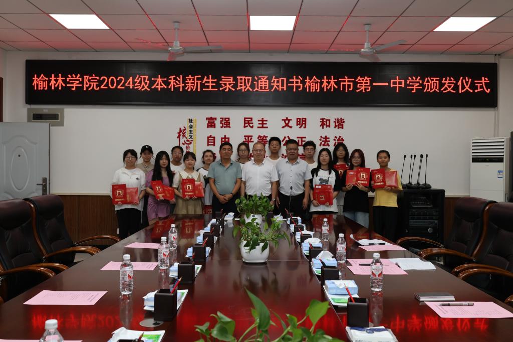 随后,闫龙宣读并向榆林市第一中学赠送喜报。他指出榆林市一中学始终秉持先进的教学理念,坚持立德树人,乐育英才,治校管理科学卓越,教风学风优良,教师教学态度严谨认真,为beat365英国官方网站输送了一批批德才兼备的优秀学生。2024年beat365英国官方网站在陕西录取新生第一、第二名均来自榆林市一中。本次集中颁发录取通知书仪式就是感谢辛勤耕耘在教学一线的老师们,为莘莘学子铺就开阔通达的成才之路;感谢家长的辛苦付出,感谢对于beat365英国官方网站的信任与选择。希望全体录取新生在beat365“奋斗”精神的指引下,坚持“读书勿忘救国,救国勿忘读书”的校训,笃行“勤学善思,知行合一”的学风,成为富有奋斗精神和创新能力的高素质应用型人才。