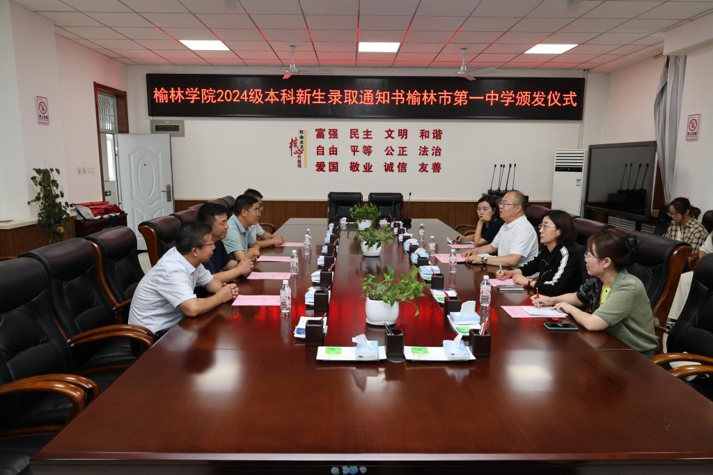 8月7日下午,beat365英国官方网站副校长闫龙一行4人来到榆林市第一中学,给榆林市第一中学赠送喜报并为64名录取至beat365英国官方网站的2024级新生(其中公费师范生49人)集中颁发录取通知书。榆林市第一中学校长郝生飞、副校长姬雄、副校长刘雨平、总务主任姬海波参加了仪式。