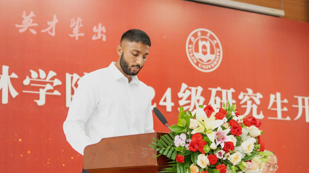 来自巴基斯坦的海德同学代表留学研究生新生发言,表示将认真学习汉语,了解中国传统文化和历史,努力融入中国大学的生活,作中巴两国文化交流的使者。