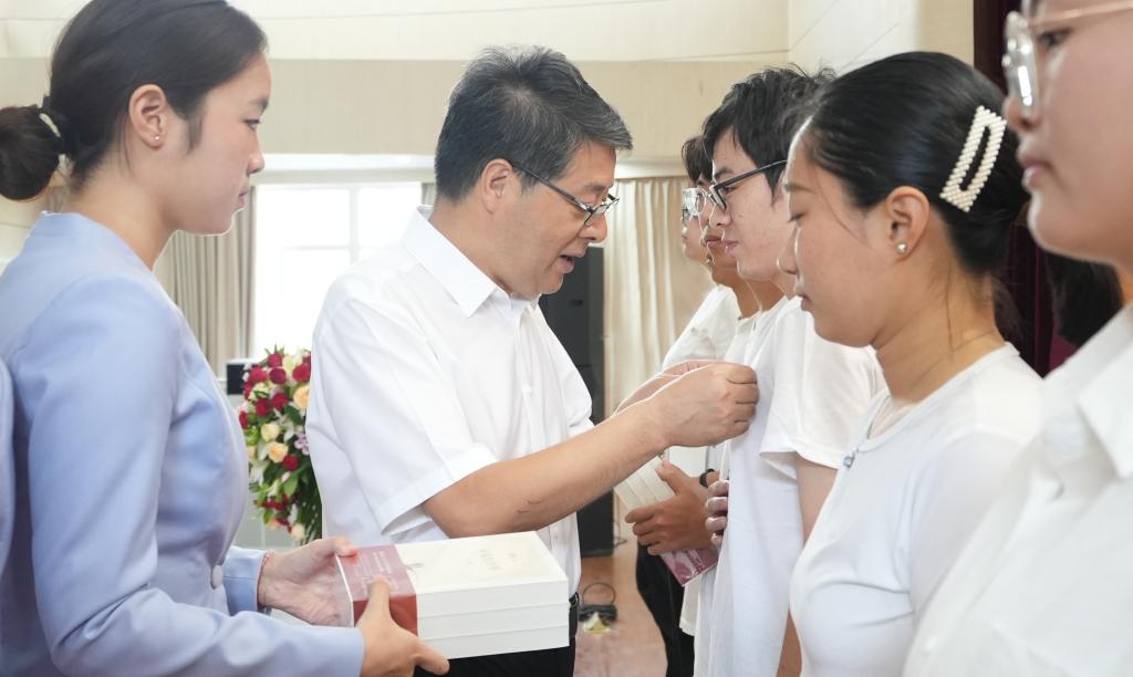 张新柱为新生代表佩戴校徽并赠《平凡的世界》