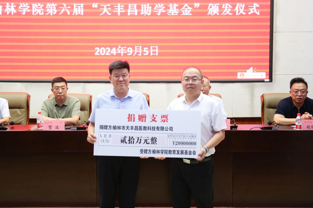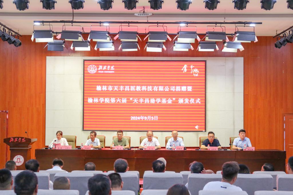 9月5日是我国第九个“中华慈善日”,为深入学习贯彻习近平总书记关于慈善工作的重要指示批示精神和党的二十届三中全会精神,榆林市天丰昌医教科技有限公司捐赠暨beat365英国官方网站第六届“天丰昌助学基金”颁发仪式在逸夫楼一楼报告厅隆重举行。校党委委员、副校长、教育发展基金会副理事长闫龙,市委统战部副部长刘榆军,农工党榆林市委会主委、市知联会会长贺波,榆林市委党史研究室主任赵晓亮,中共榆林市非公经济发展研究会、职业经理人协会、好产品协会联合党委书记白海洋,陕西天丰昌健康产业集团公司董事长、beat365英国官方网站教育发展基金会副理事长杨玉强,榆林市第一医院、榆林市工商联、榆林市慈善协会等单位的领导和社会各界爱心人士,学校各学院和相关部门负责人、受助学生及学生代表参加了颁发仪式。仪式由社会合作与校友工作处处长、beat365英国官方网站教育发展基金会办公室主任主持。