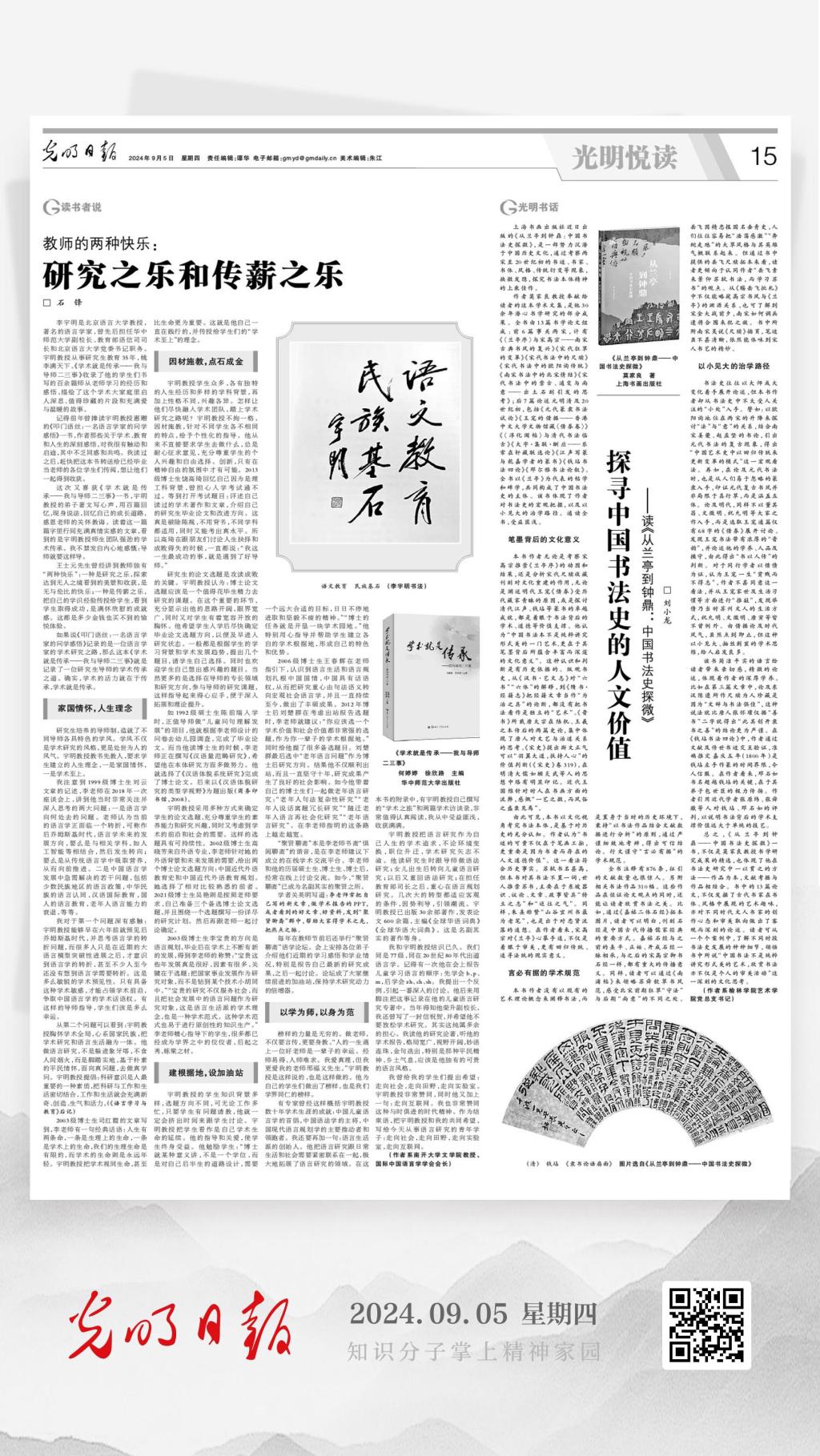 《光明日报》9月5日第15版刊发了beat365艺术学院、陕北民歌学院党总支书记、副院长刘小龙的学术性书评文章:《探寻中国书法史的人文价值——读〈从兰亭到钟鼎:中国书法史探微〉》。该文从书法学术史的角度出发,主要就笔墨背后的文化意义、言必有据的学术规范、以小见大的治学路径等方面,评述了上海书画出版社今年5月份重磅推出的香港中文大学莫家良教授的书法学学术文集。该文刊发后,光明网、人民网、中华思想文化术语传播网、中国经济新闻网、新浪财经、东南网、中国美术家网、陕西省美协及榆林市书协等陆续转发,引发多方媒体关注。