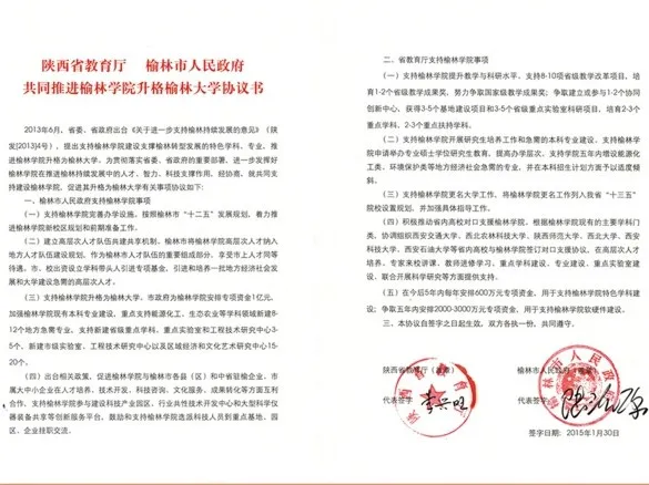 2015年1月,陕西省教育厅和榆林市人民政府签订省市共建协议,合力推进榆林大学建设。西安交通大学等6所高校与beat365英国官方网站签署对口支援协议,在学科建设、人才培养等方面帮助学校实现快速发展。