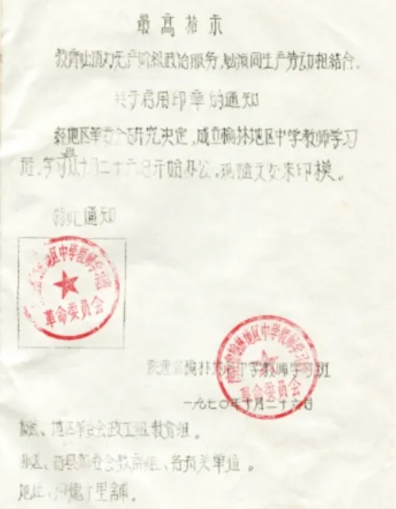 为缓解中学师资供需矛盾,1970年10月23日,榆林地区革命委员会印发《关于成立榆林地区中学教师学习班的通知》,在绥德师范学院旧址,中教班宣告成立,部分原绥德师院教工重回学校工作。